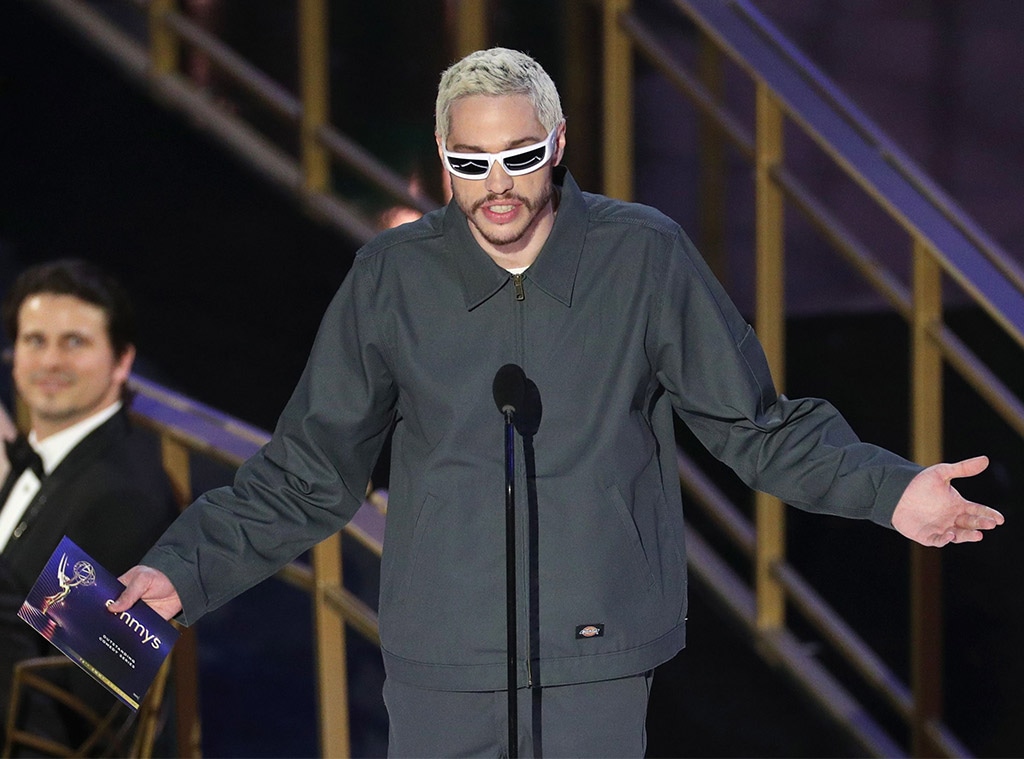 At the Emmy awards in 2022, Davidson, 28, completed the ensemble with a pair of his characteristic sunglasses. He was wearing a charcoal gray unlined Eisenhower Jacket from Dickies and matching gray slacks. It was his first public appearance after his breakup with Kim in August 2022.