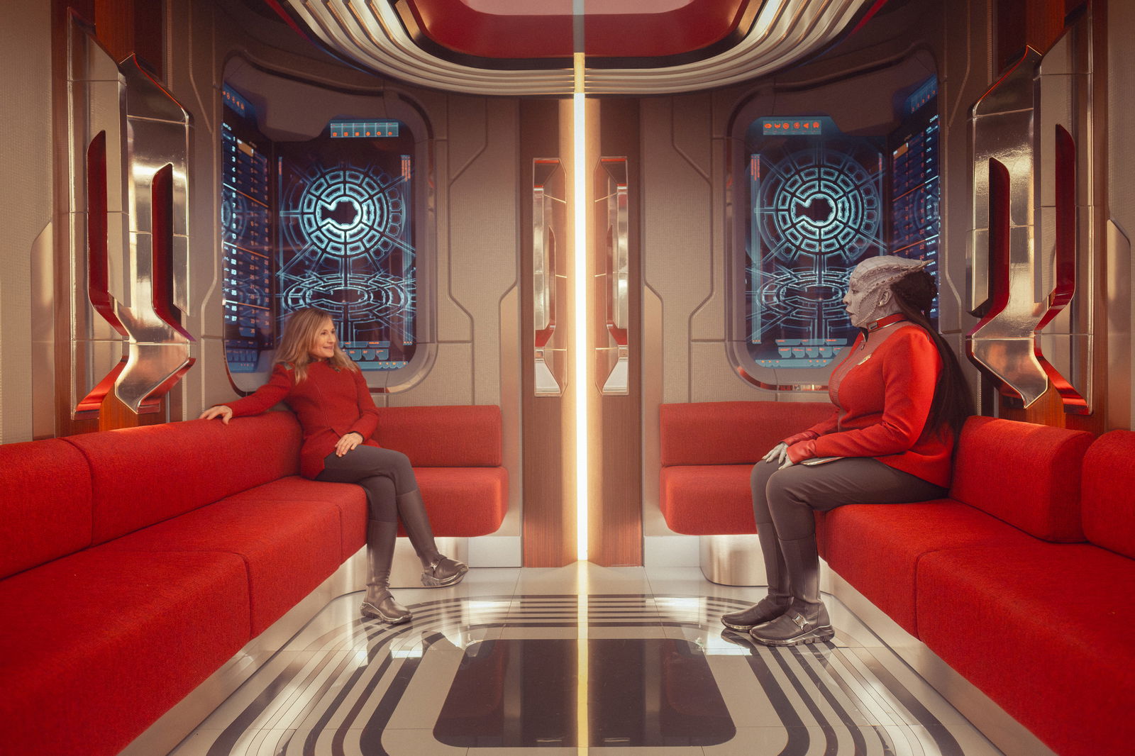 Elsewhere, Nahla Ake actively flees a conversation with the Doctor, who is far too enthusiastic about vanilla mucus viscosity. She redirects straight into Luna Krok’s orbit to discuss preparations for an upcoming Federation banquet. That calm dissolves the moment Nahla enters her office and hears raised voices. Caleb and Darem are already there, arguing loudly and in unison about the same thing: neither is willing to share a room with the other.